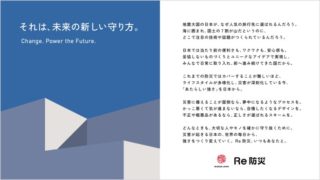お知らせ Re防災project 新しい取り組みへ 新しくブランドロゴも作られ、産官学民すべての皆さまと共に創る災害対策の取り組みに一層磨きをかけて参ります。今だからできる事、今やるから活かされる事を今からみんなで。 2025.03.01 お知らせ