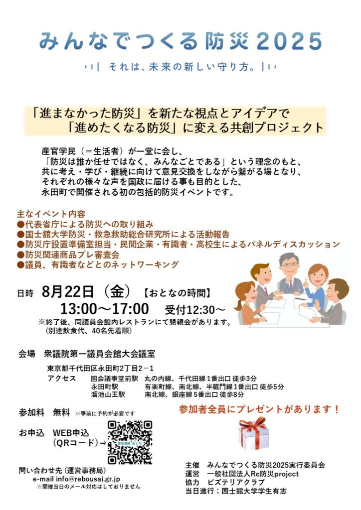 産官学民(=生活者)が一堂に会し、「防災は誰か任せではなく、みんなごとである」という理念のもと、共に考え・学び・継続に向けて意見交換をしながら繋がる場となり、それぞれの様々な声を国政に届ける事も目的とした、永田町で開催される初の包括的防災イベントです。